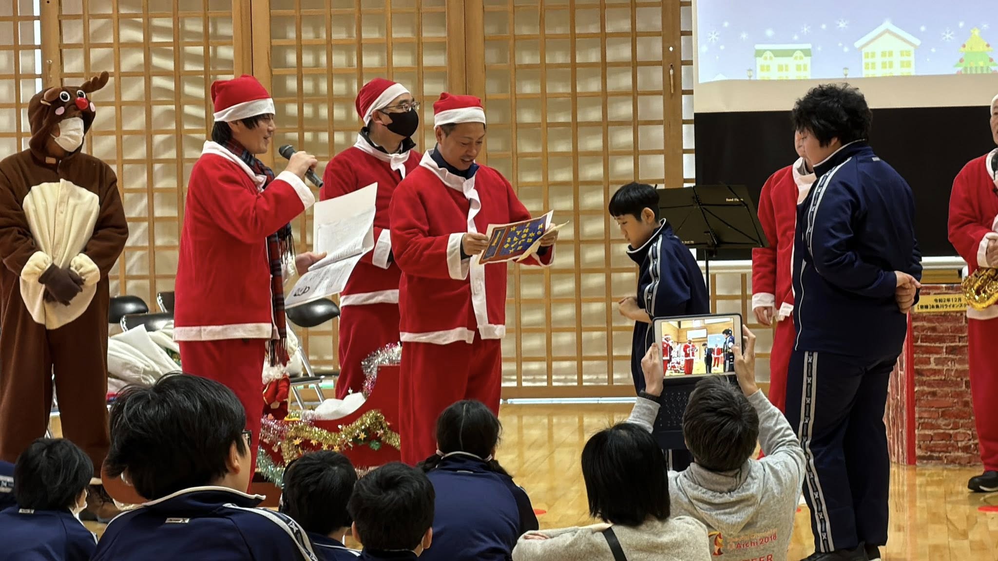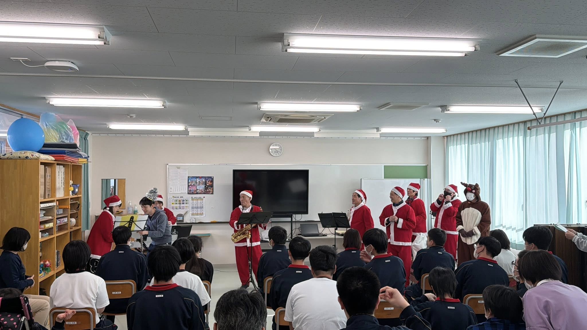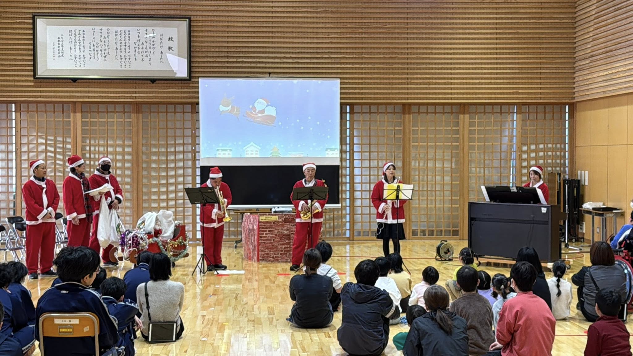 本日は、終業式に合わせてサンタ訪問活動を実施しました。今回も昨年同様リトルチュチュのメンバーwith橋立さんにクリスマスソングの演奏を披露して頂きました。更に沢山プレゼントをお渡しでき大変喜んで頂けたと思います。
