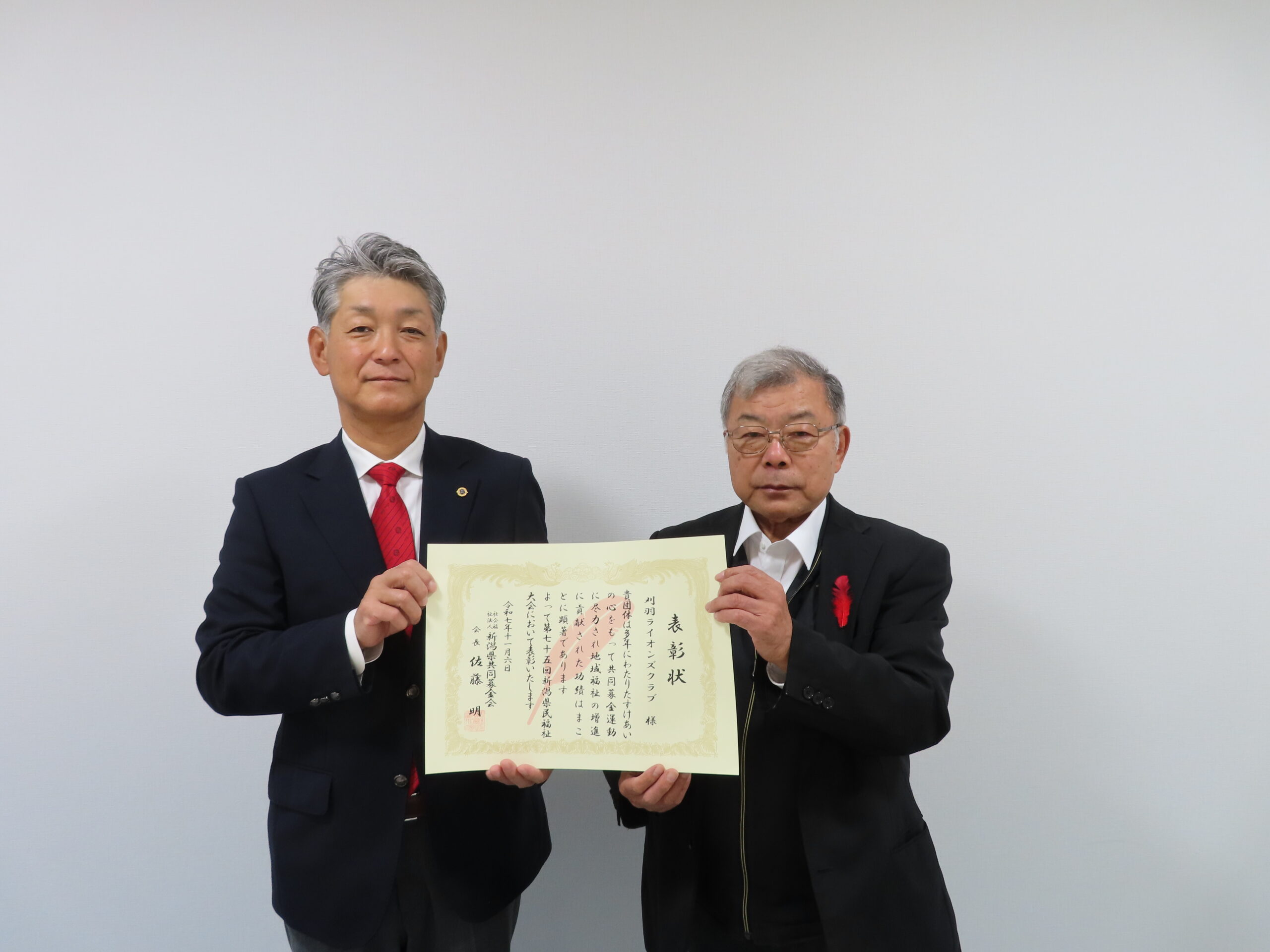 新潟県共同募金会会長表彰 ホーム各種お知らせクラブからのお知らせ刈羽ライオンズクラブ 刈羽ライオンズクラブ 2025.11.11 第75回新潟県民福祉大会において、共同募金運動を5年以上協力し、功績顕著な団体として 令和7年度新潟県共同募金会会長表彰をいただきました。 当クラブでは平成6年から歳末助け合い募金への協力を始め、今現在も会員企業に募金箱を設置 し、多くの方からご協力いただいております。今後も継続アクティビティとして活動をしていき たいと思います。大変ありがとうございました。