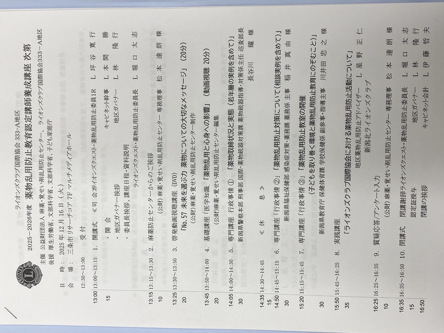 薬物乱用防止研修会への参加 2025年12月16日(火) ホーム各種お知らせクラブからのお知らせ糸魚川ライオンズクラブ 糸魚川ライオンズクラブ 2025.12.16 2025年12月16日(火)、に参加してまいりました。今回参加したのは、L本間、L松木公久、L清水直樹の3名です。 研修では、薬物の最新事情や指導現場での伝え方、効果的な啓発のポイントなどについて学びました。講師としての理解を深めることで、今後の活動に自信を持って臨める貴重な機会となりました。 引き続き、地域における薬物乱用防止活動を着実に進めてまいります。
