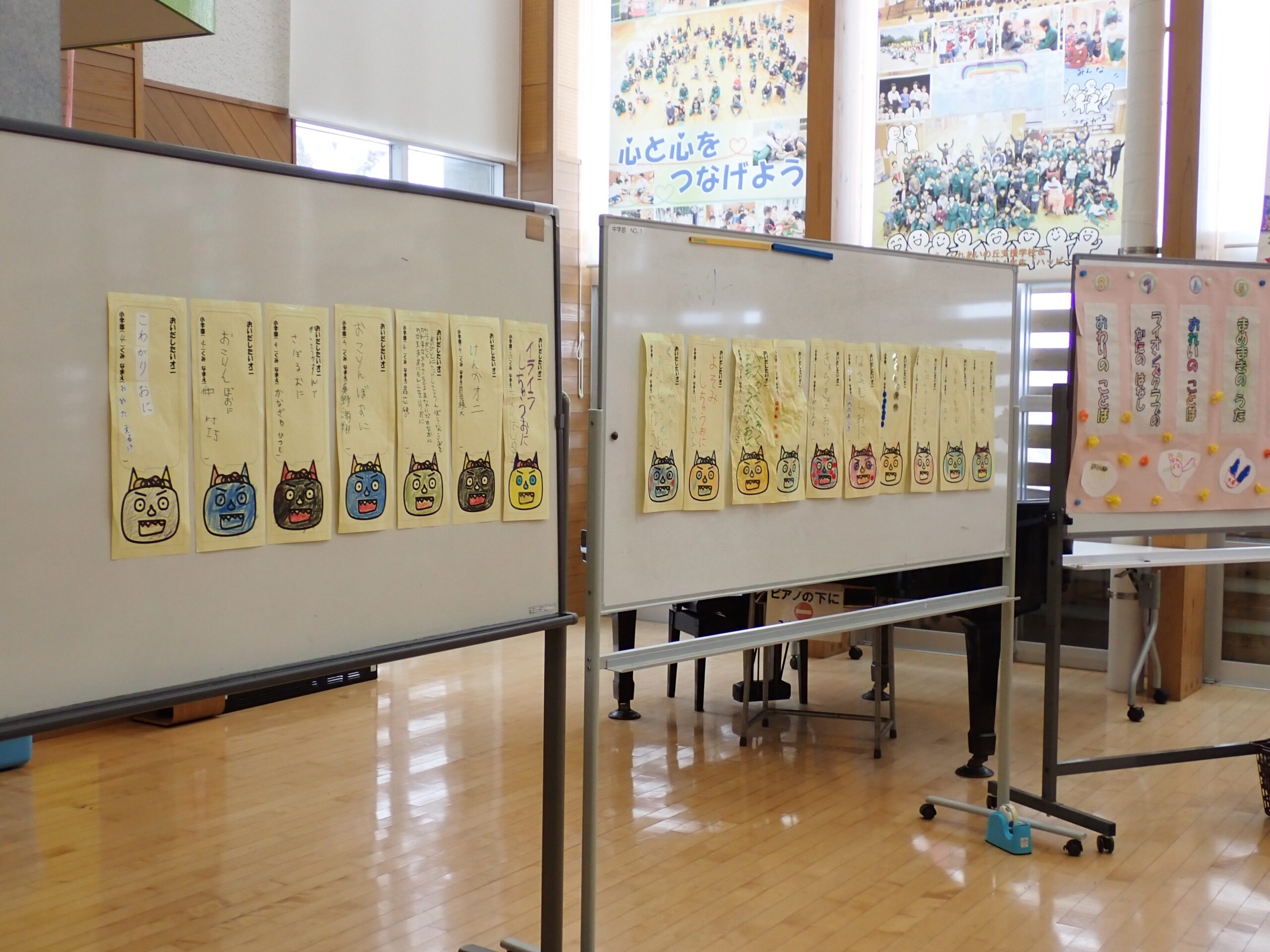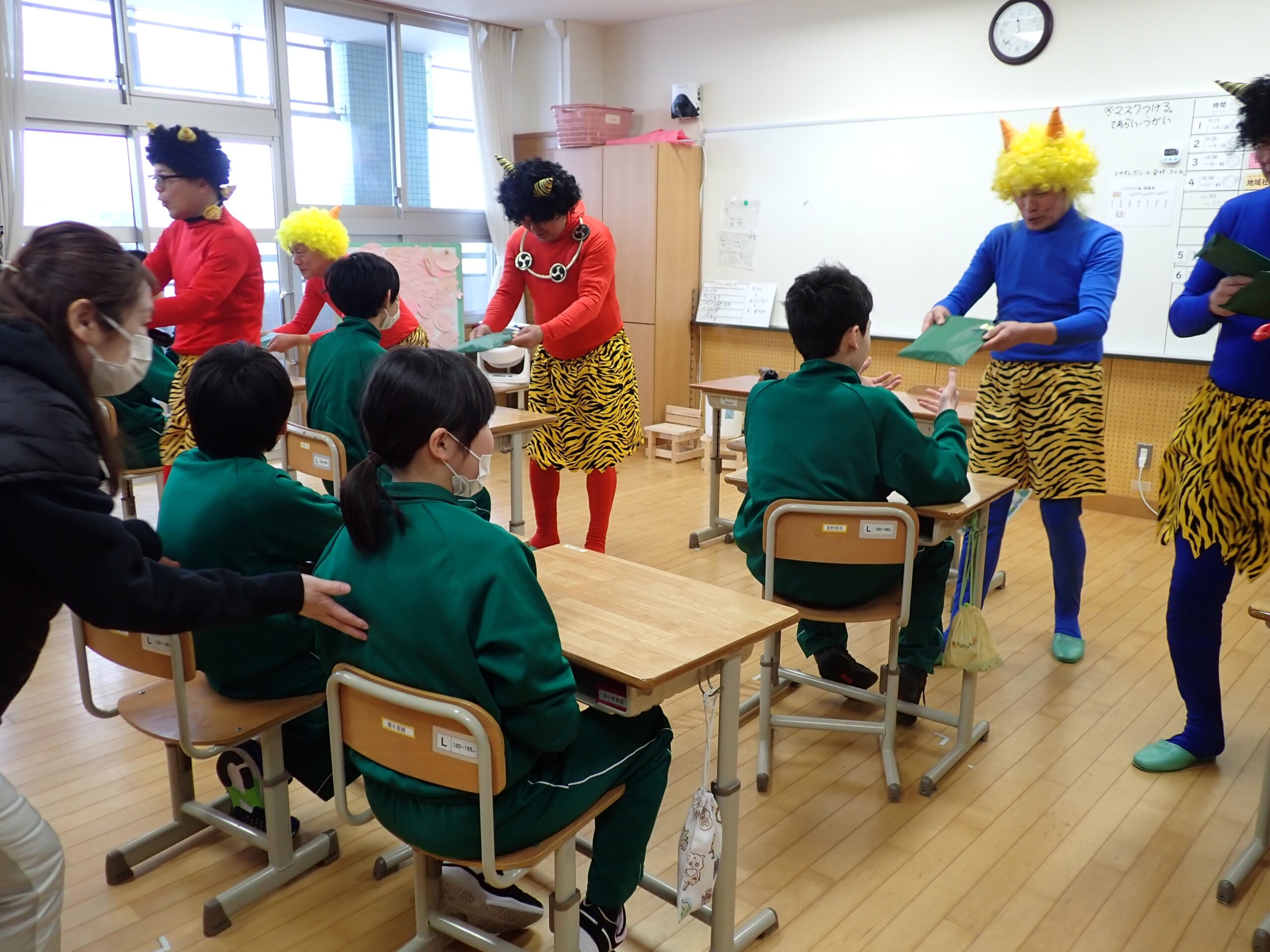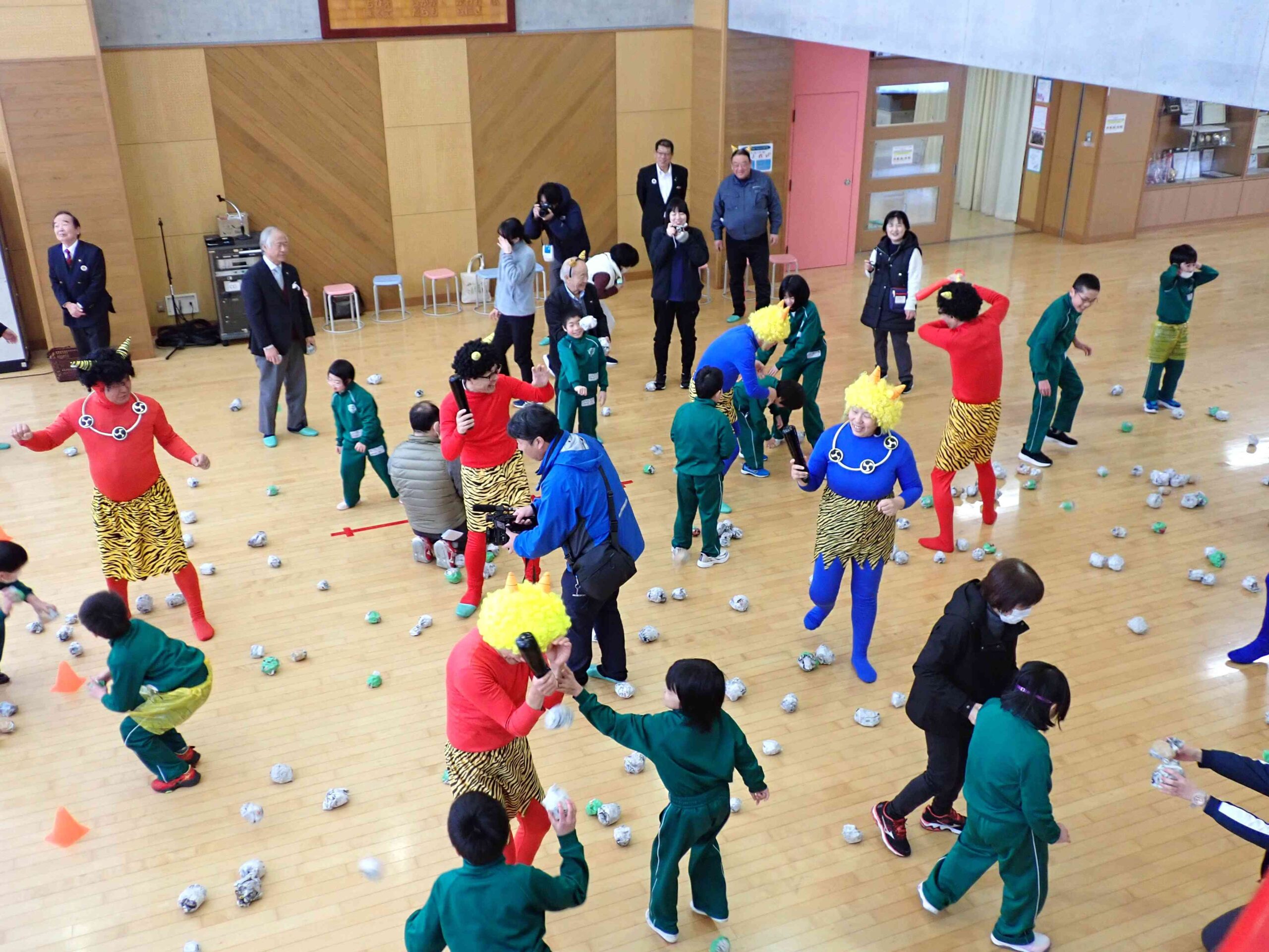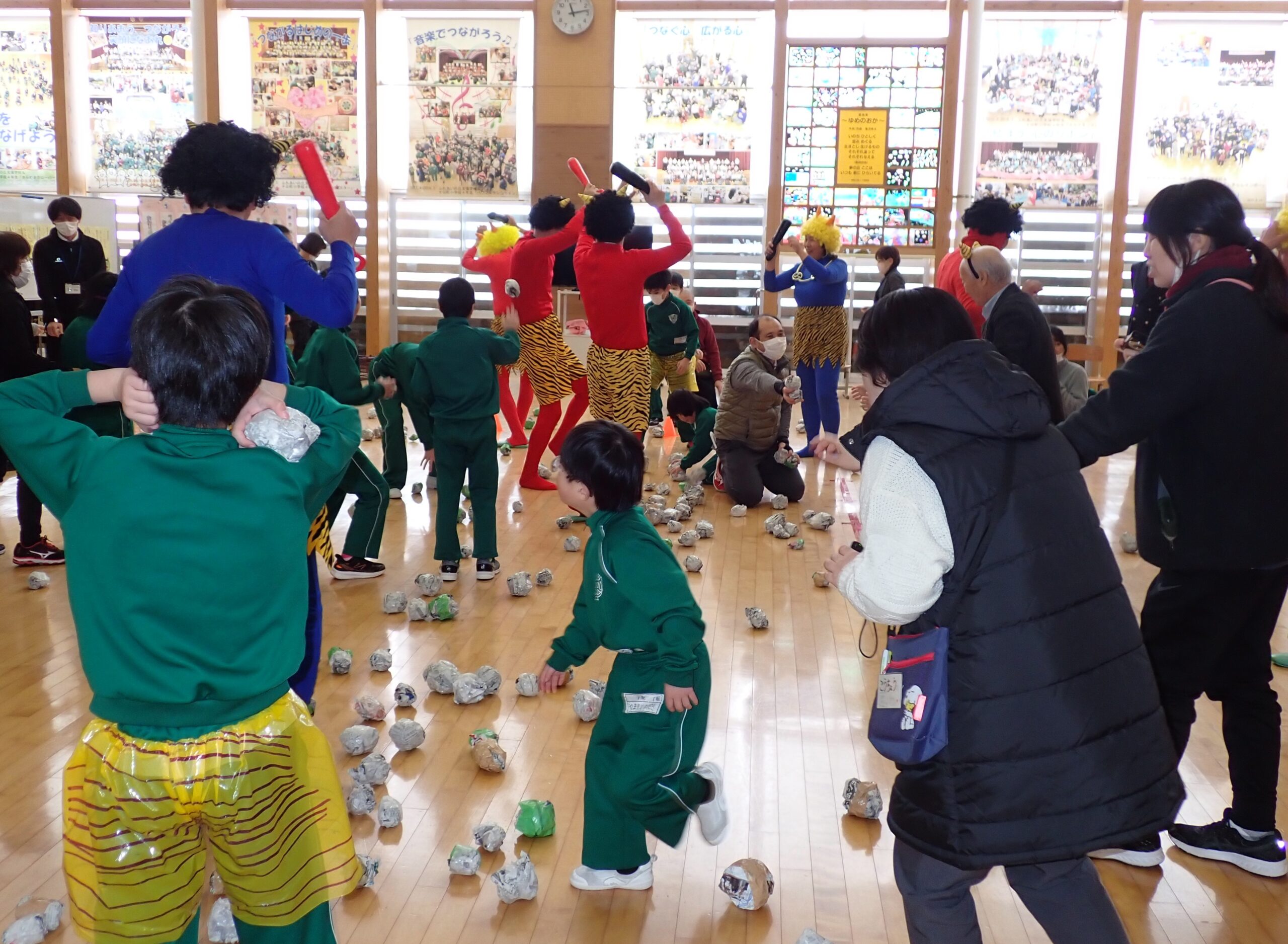はじめの言葉、校長先生からの節分のお話に次いで、子供たちは自分の中にいる追い出したい心の鬼を発表します。鬼を退治する豆まきの準備をし「鬼さ~ん」の掛け声で鬼登場。「悪い子はいないか」と寄ってくる鬼に子供達は逃げ回りますが、勇気を出して「鬼は外」と叫びながら豆(紙を丸めた玉、あたるとちょっと痛いです)を投げつけます。暫くすると、鬼は「参った、参った」と降参。子供たちと鬼は仲良しになります。その後、節分の歌を一緒に歌い、子供達一人一人にプレゼントを渡します。児童からお礼の言葉を貰い、最後にみんなで記念撮影をしました。