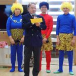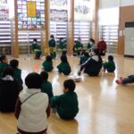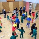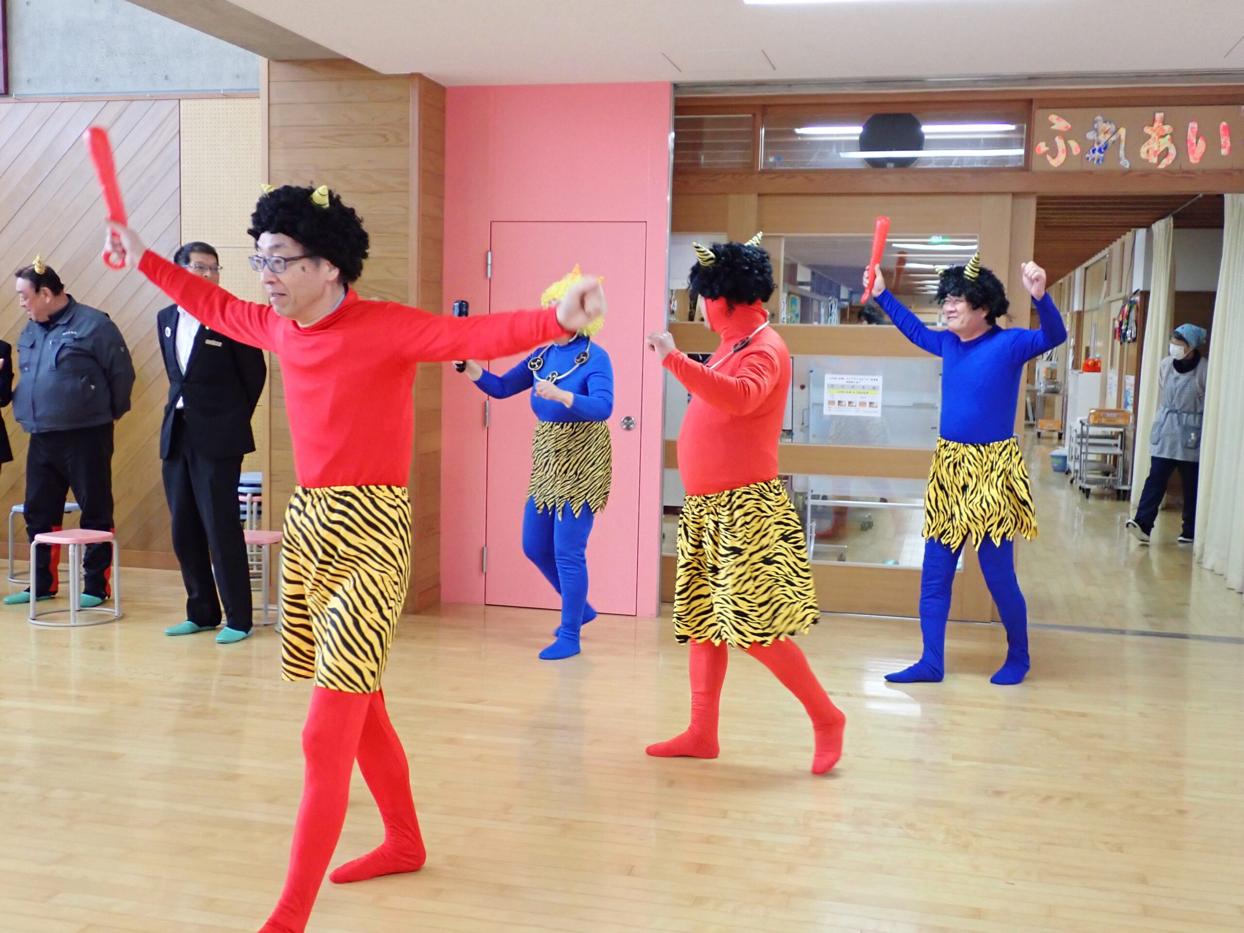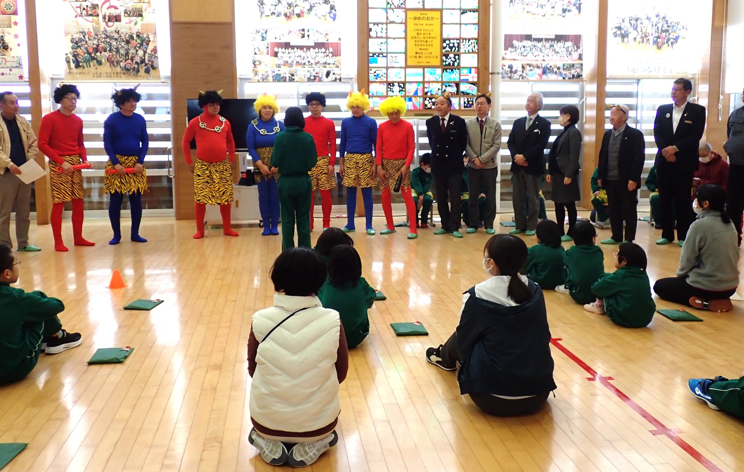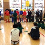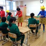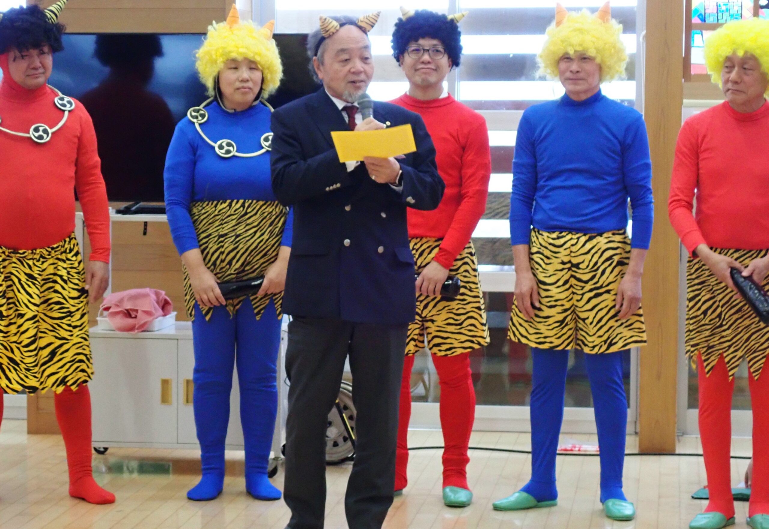 はじめの言葉、校長先生からの節分のお話に次いで、子供たちは自分の中にいる追い出したい心の鬼を発表します。鬼を退治する豆まきの準備をし「鬼さ~ん」の掛け声で鬼登場。「悪い子はいないか」と寄ってくる鬼に子供達は逃げ回りますが、勇気を出して「鬼は外」と叫びながら豆(紙を丸めた玉、あたるとちょっと痛いです)を投げつけます。暫くすると、鬼は「参った、参った」と降参。子供たちと鬼は仲良しになります。その後、節分の歌を一緒に歌い、子供達一人一人にプレゼントを渡します。児童からお礼の言葉を貰い、最後にみんなで記念撮影をしました。