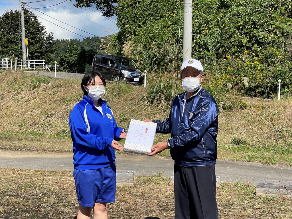 当クラブは今年度60周年を迎えるに当たり、過去のアクティビティを振り返り、メンテナンスを行い、今後へと繋げていこうということで、ライオンズ(奉仕)・デー移動例会として、山古志小・中学校の植樹プレートのメンテナンスと樹の廻りの清掃(草取り)を生徒達と一緒にさせて頂き、記念品としてクラブ名入えんぴつを生徒全員分寄贈させて頂きました。
