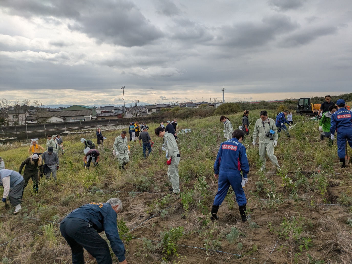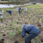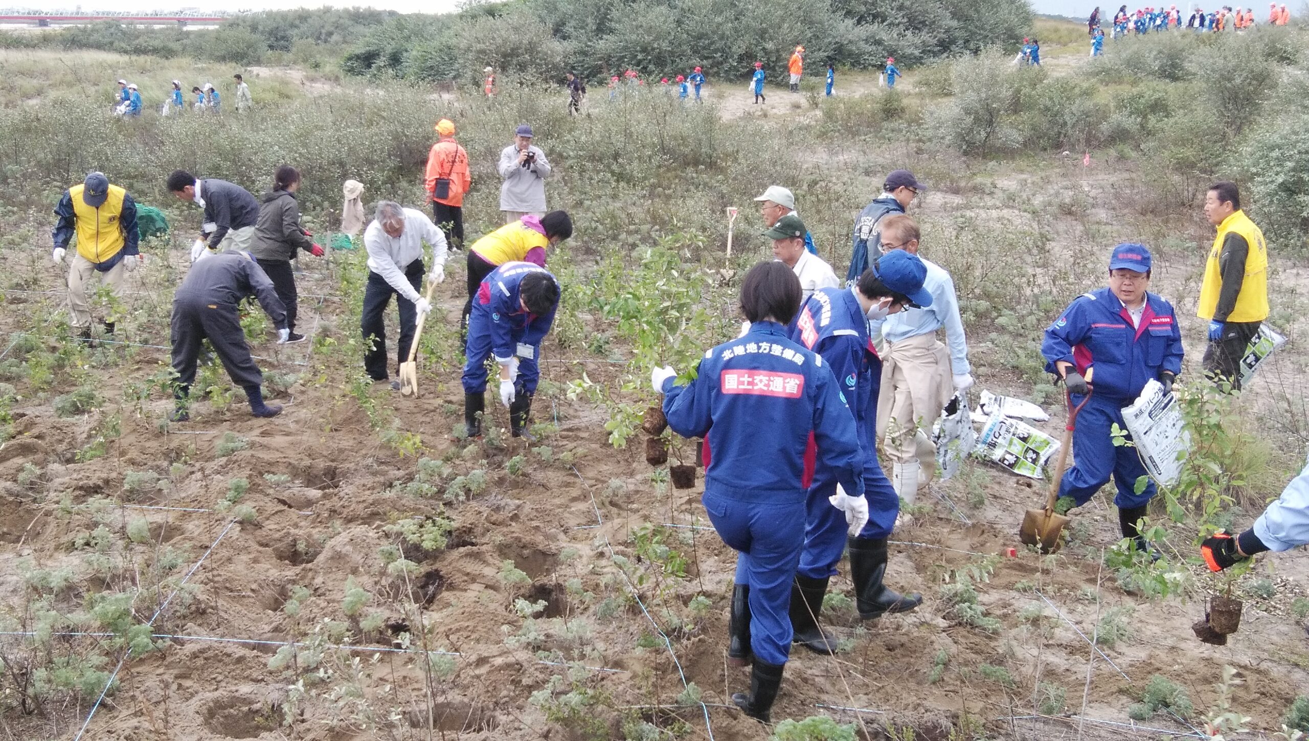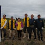 近隣の小学校の生徒さんも一緒に防砂林の役割のあるアキグミの植えていくのは、かなりの重労働ですが、曇天の中、ぎりぎり雨も降らず終了することができました。