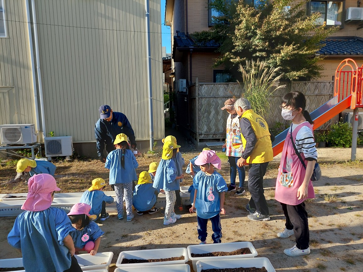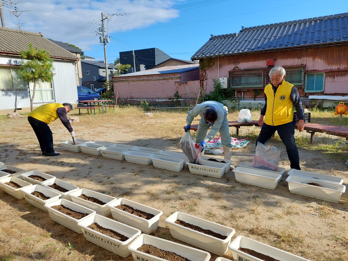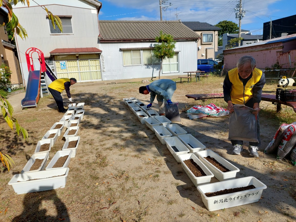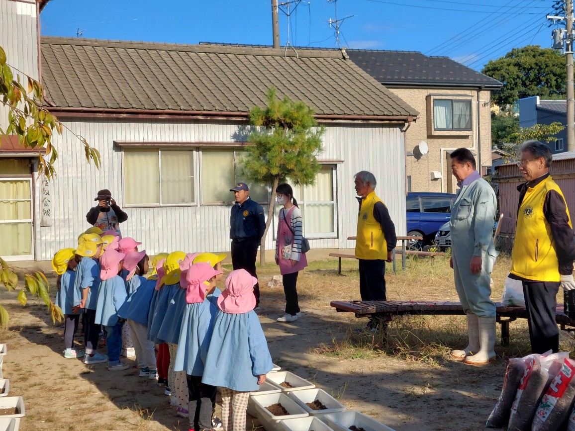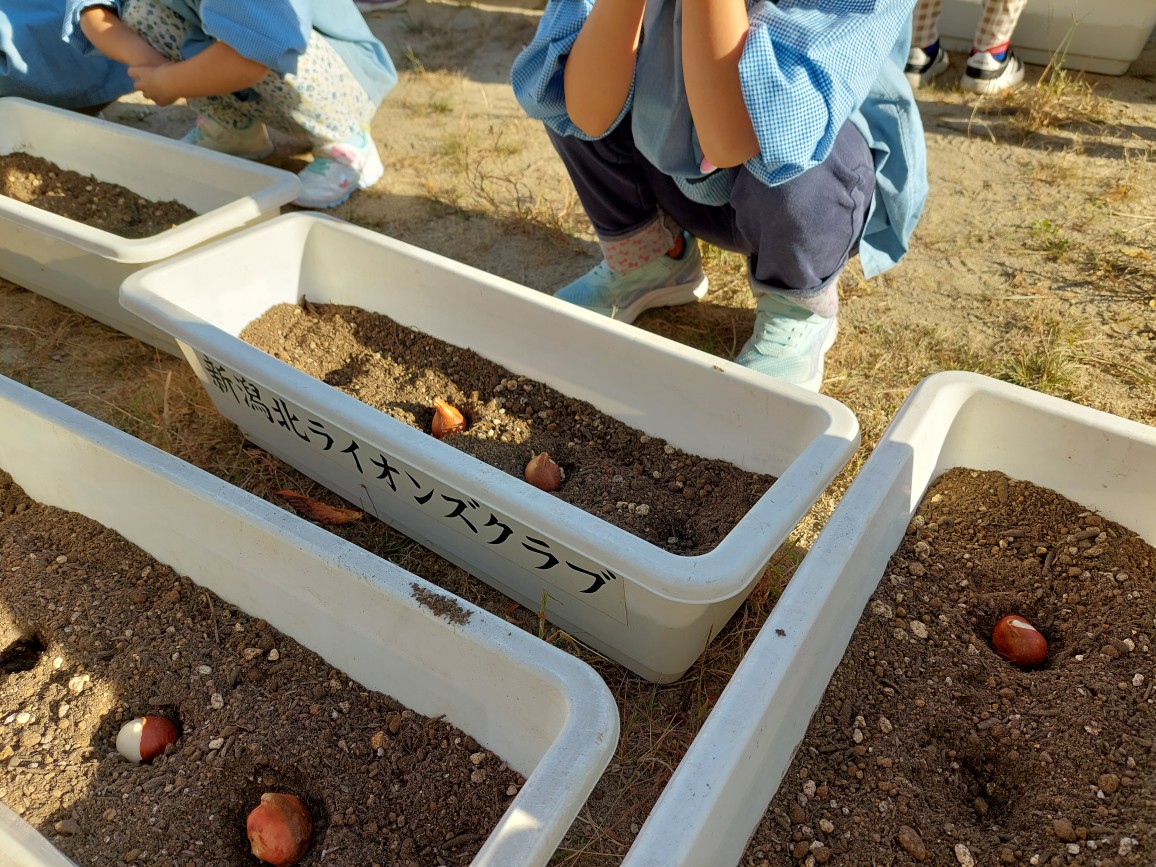 10月24日(金)、チューリップの球根を植えました。 ホーム各種お知らせクラブからのお知らせ新潟北ライオンズクラブ 新潟北ライオンズクラブ 2025.10.27 2025年10月24日(金)、近くのこども園の園児さん達と、毎年恒例のチューリップの球根植えを行いました。 来年の春、北区にある松港橋に設置する為、この時期に球根を植えています。 園児さん達を、見ていたら童謡の「チューリップ」を思い出しました。 童謡の「チューリップ」の初出は1932年(昭和7年)だそうで、93年前になります。 もう少しで100年を迎える歌だと知り、ビックリです。