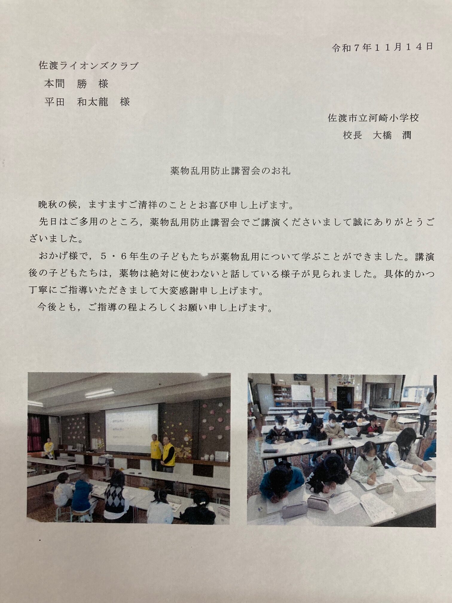 佐渡市立河崎小学校において、333-A地区薬物乱用防止教育講師のL本間勝とL平田和太龍が講師で 5年生・6年生の児童27名に薬物乱用防止教室を開催しました。林隆行ガバナーも駆けつけ、ご挨拶いたしました。