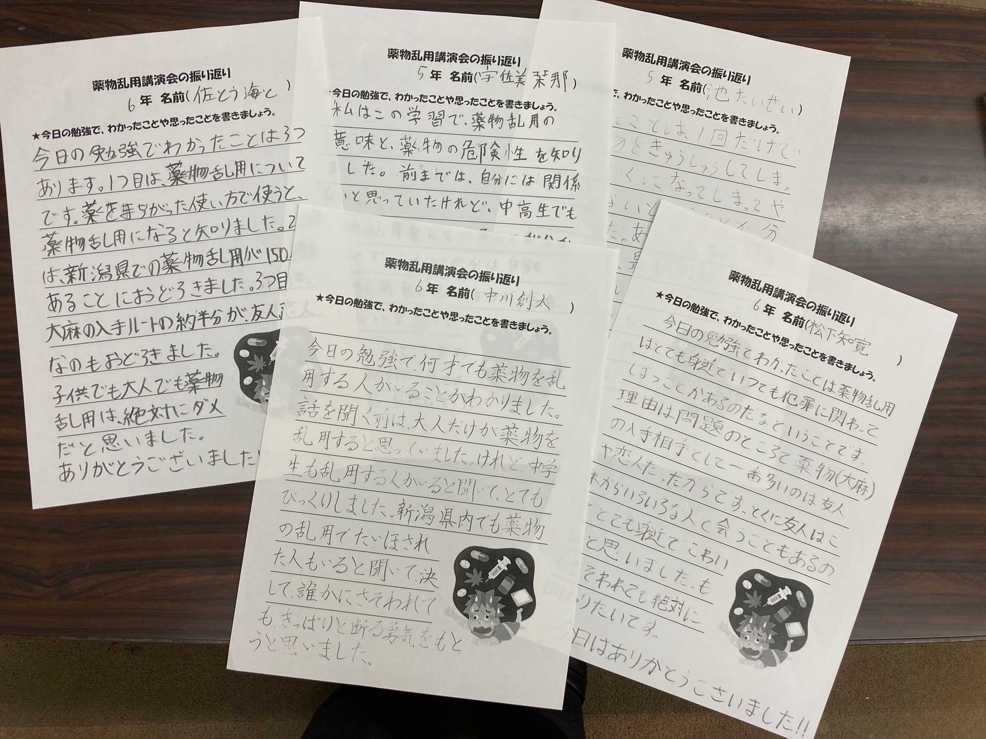 今回の授業は午後1時40分から2時25分まで、資料とパワーポイントをなるべく使い分かりやすく、また薬物乱用の怖さを伝えるとともに、万が一誘われても断る勇気を持つことの大切さを伝えました。真剣に授業を受ける児童の皆さんを前に当クラブとして初めての薬物乱用防止教室を開催することができました。後日学校より、授業の後 子どもたちが『薬物は絶対使わない!』と話す様子が見られましたとお礼状をいただき、また児童の皆さんからの感想文もお送りいただきました。