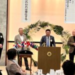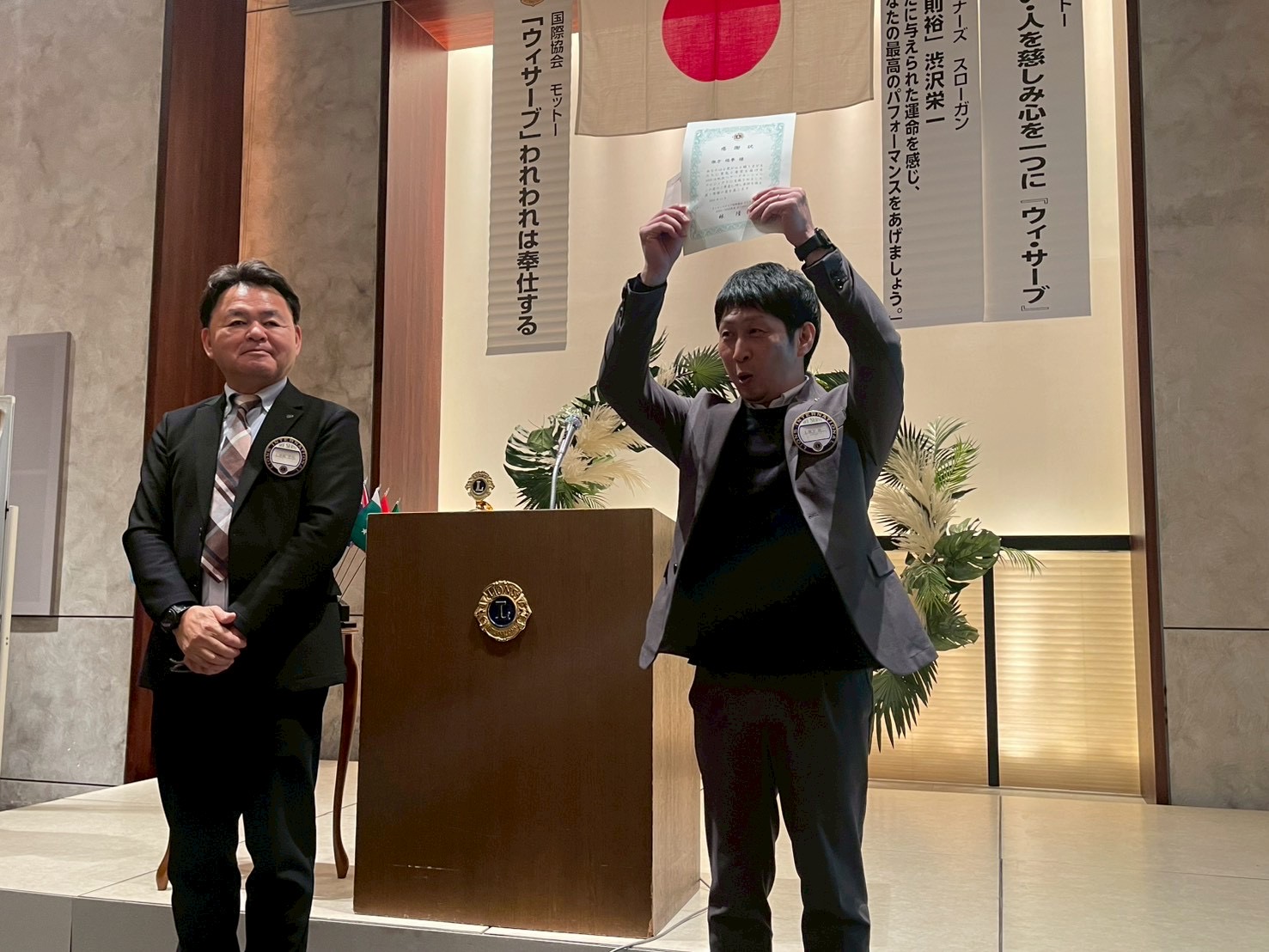 ☆新入会員とスポンサーへバッヂの伝達:2025年9月に入会されました小籔 將人Lとスポンサーの今井 富雄Lに地区ガバナーより記念品などが贈られました。