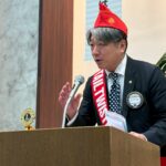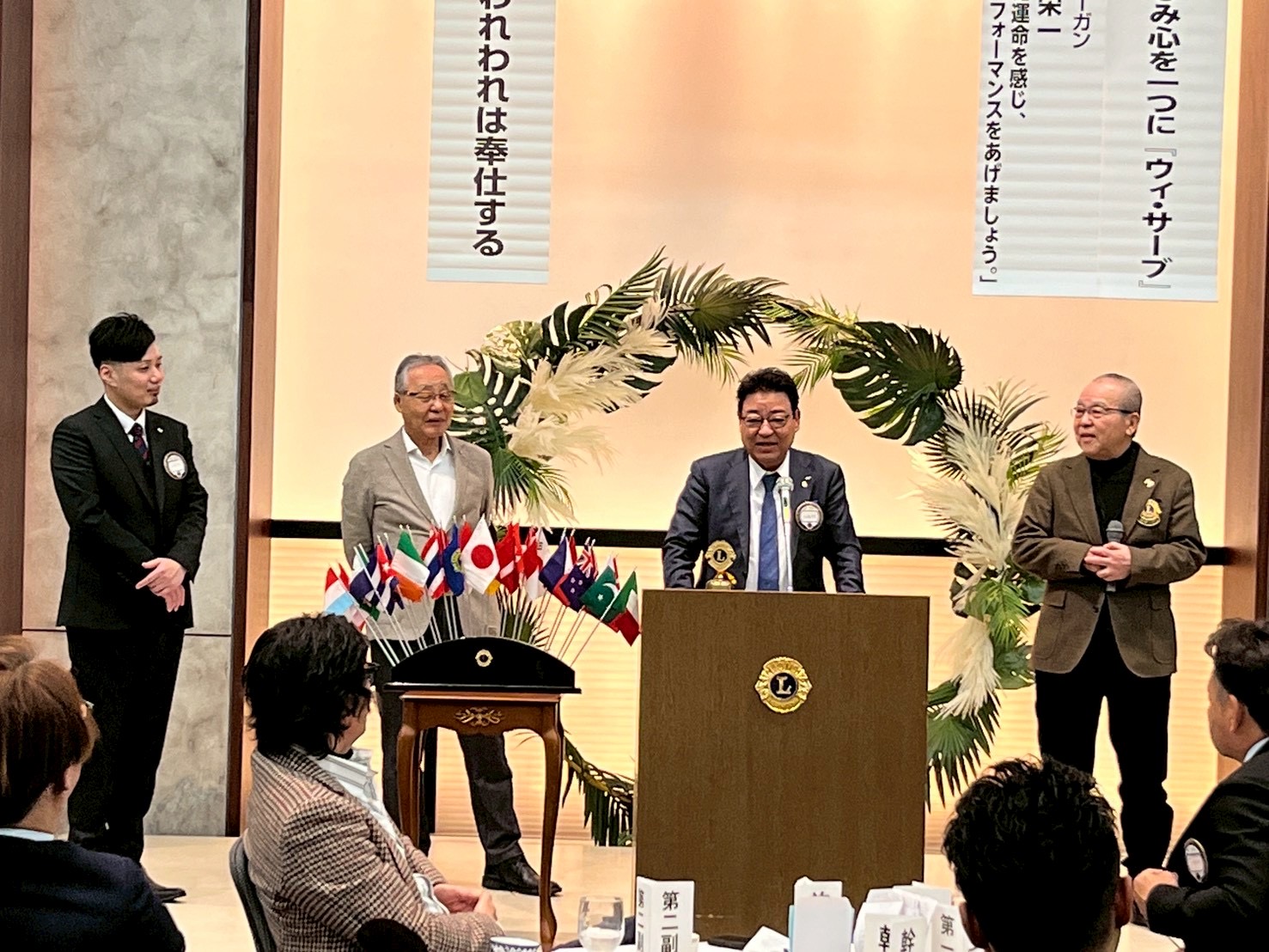 ライオンズクラブの活動を紹介する会員拡大PR動画を見てもらった後、会員・会員拡大・出席大会委員長の今井富雄Lが登壇し、上村善男L、北澤和博L、小藪將人Lを壇上に呼び込み、入会のきっかけを聞いたり、ライオンズクラブを楽しむ秘訣などについて笑いを交えて引き出していました。